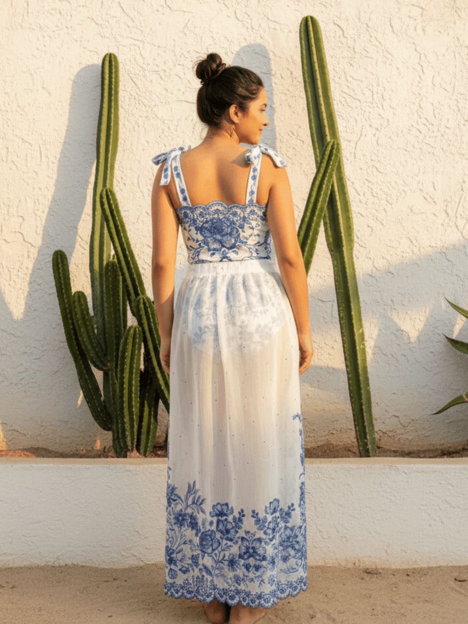 Effortlessly chic swimsuit set featuring a blue toile print, adjustable tie-shoulder straps, and a sheer matching sarong for versatile beach-to-bistro style.