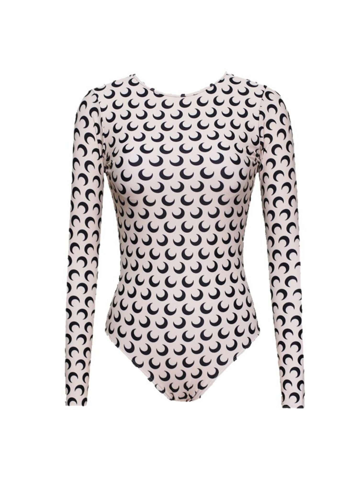 Make a stylish statement with this chic, long-sleeved one-piece swimsuit featuring an all-over crescent moon print and a flattering low-back design.