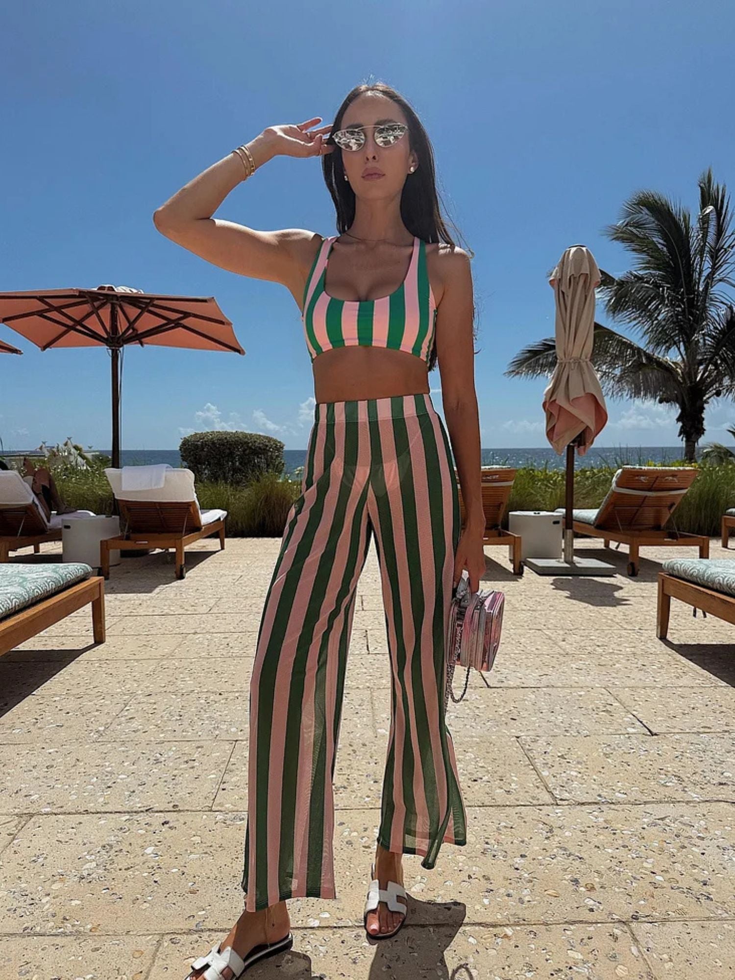 Turn heads in the Palm Breeze Striped Bikini Set With Pants, featuring a chic bikini top paired with matching bottom and high-waist pants. Designed with bold vertical stripes in pink and green, this set is perfect for a stylish and comfortable day look. The crop top's bralette-style cut offers a flattering fit, while the pants give a sleek, elongated silhouette. Lightweight and breathable, this set is easy to dress up with accessories or keep casual with slides.
